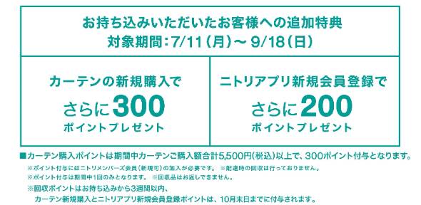 今回も第1弾と同様、期間中にカーテンを持ち込むと、ニトリポイントを300ポイントを付与する。また、対象期間中(7月11日〜9月18日)に税込5500円以上のカーテンをニトリで購入したニトリメンバーズには、さらにニトリポイントを付与する企画も同時に行う。