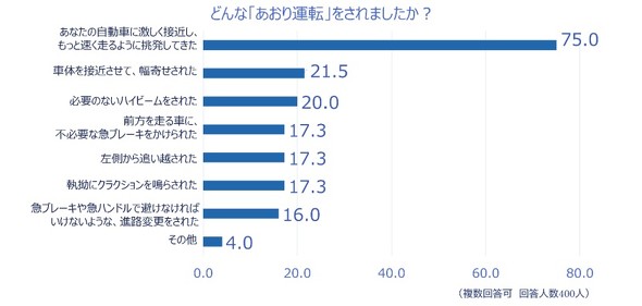 あおり運転で受けた被害については、「自動車に激しく接近し、もっと速く走るように挑発してきた」(75.0%)が最も多く、「車体を接近させて、幅寄せされた」(21.5%)、「必要のないハイビームをされた」(20.0%)と続いた。