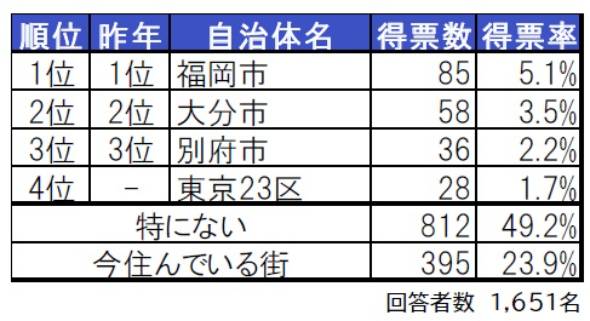 22年の「住みたい街ランキング」は、昨年は九州・沖縄の自治体のみを対象として集計したが、今年は全国の自治体を対象とした。1位から3位までは変動なく、1位は福岡市、2位は大分市、3位は別府市で、4位に今回新たに東京23区がランクインした。