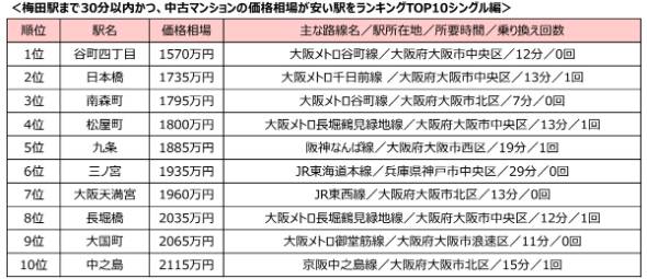 残りのトップ10には「松屋町」(同1800万円)、「九条」(同1885万円)、「三ノ宮」(同1935万円)、「大阪天満宮」(同1960万円)、「長堀橋」(同2035万円)、「大国町」(同2065万円)、「中之島」(同2115万円)がそれぞれ続いた。