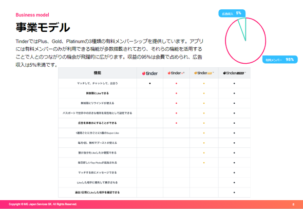 というのは、広告収入に収益が基づいていて、滞在時間の最大化を狙っている企業と、当社はビジネスモデルが異なるからです。売り上げの90%以上がメンバーからの会員費で構成されています。だからメンバーには、Tinderで知り合った人と直接、会ってもらいたいのです。