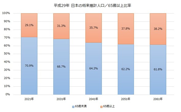 国立社会保障・人口問題研究所が公表した「日本の将来推計人口(平成29年推計)」によると、人口に占める21年の65歳以上比率は出生・死亡中位推計で29.1%。10年後の31年には31.3%、さらに10年後の41年には35.7%と上昇し続けます。(以下グラフ)