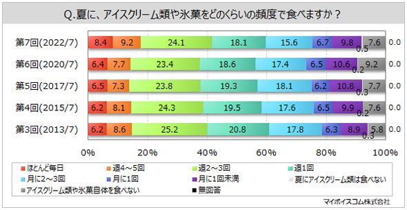 夏にアイスクリーム類を食べる人は9割以上で、食べる頻度は「週2〜3回」が最も多い。週1回以上食べる人は約6割で、2020年調査と比べて微増していた。