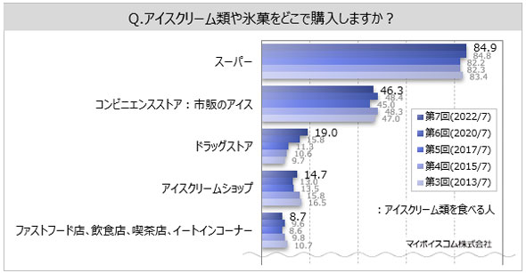 購入場所は「スーパー」が84.9%、「コンビニエンスストア:市販のアイス」が46.3%、「ドラッグストア」「アイスクリームショップ」が各10%。過去調査と比べて、「ドラッグストア」が増加傾向にある。「ドラッグストア」は女性30〜40代、北陸、四国、九州で高くなっていた。