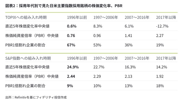 同様の分析を米国企業で行うと、興味深いことに日本企業と異なる傾向が確認できます。S&Pコンポジット1500指数(注:S&P500、S&P中型株400、S&P小型株600の合成)の直近5年間の株価変化率(中央値)は、古い年代の企業群ほど優れた結果となっています。PBRについても同様に、日本企業とは逆に古い年代の企業群ほど高くなっています。