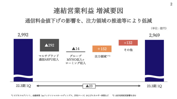 マルチブランド通信ARPUは、auよりも料金設定が低いUQ mobileやpovoが好調なことから前年同期比でマイナス310円の3970円となったが、「想定の範囲内」(高橋氏)としている。