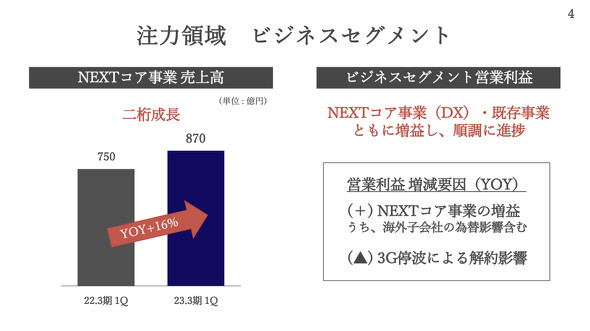 注力領域のビジネスセグメントは、DXを中心とするNEXTコア事業の売上高が前年同期比プラス16%の2桁成長。ビジネスセグメント営業利益は、NEXTコア事業、既存の通信事業も増益となり順調に進捗している。