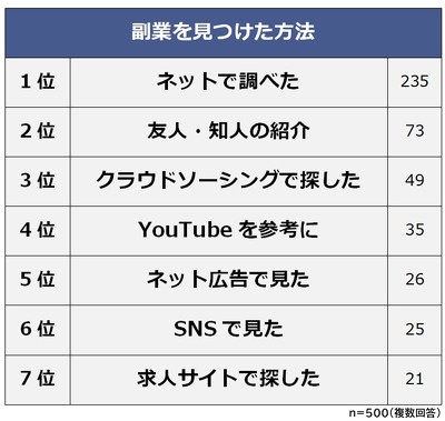 副業の見つけ方は「ネットで調べた」(235人)が最も多く、「友人・知人の紹介」(73人)、「クラウドソーシングで探した」(49人)と続いた。