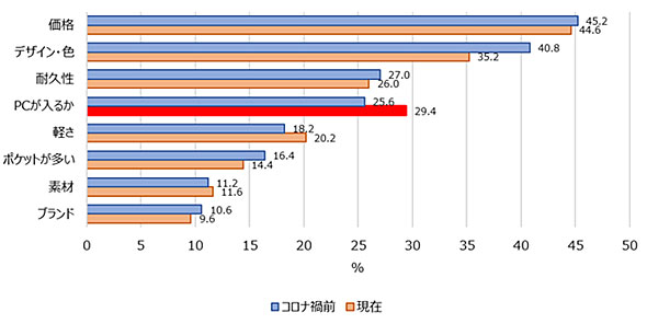 ふむふむ。確かに、新型コロナの感染が広がって、ノートパソコンが入るカバンを持つ人が増えたような気がする。とある調査(※)でも、ビジネスバッグを選ぶ際に重視しているポイントとして、「パソコンが入る」が3位に入っていて、コロナ前と比べてぐーんと伸びていた。