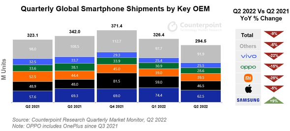 市場調査会社カウンターポイント・リサーチ(以下、カウンターポイント)によると22年4-6月の世界スマートフォン出荷台数は、前年同期比9%減の2億9500万台。上位5ブランドのうち成長したのはサムスンのみで、シャオミの下げ幅は最も大きい25%だった。