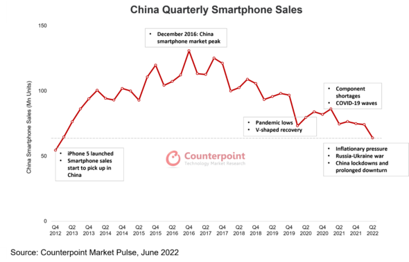 カウンターポイントによると22年4-6月の中国のスマートフォン販売台数は同14.2%減り、12年10-12月の水準まで落ちた。ちなみにこの数字はスマートフォンの売り上げがピークだった16年10-12月期の半分以下だ。