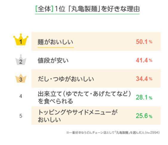 好きなうどんチェーンとして「丸亀製麺」を選んだ人に理由を聞くと、「麺がおいしい」(50.1%)が最も多かった。以下「値段が安い」(41.1%)、「だし・つゆがおいしい」(34.4%)と続いた。