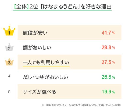 「はなまるうどん」を選んだ人の理由の1位は「値段が安い」(41.7%)だった。2位は「麺がおいしい」、3位は「一人でも利用しやすい」(27.5%)。