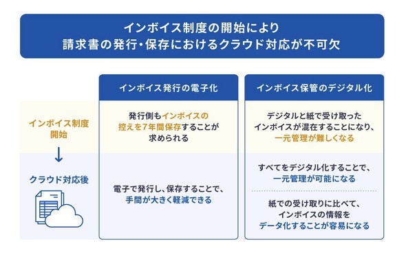 まずインボイス制度においては、これまで不要だった発行側の書類保管も義務化される。この時点で管理する紙の量が単純に2倍になる。そのため、多くの事業者が管理の容易な電子発行を選ぶと想定されている。PDFをメールに添付するようなやり方だ。