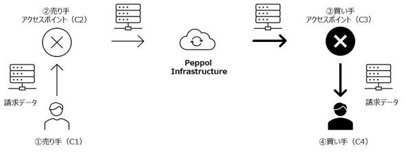 PeppolではXMLを使いフォーマットを規定すると共に、メールでいう送信サーバ、受信サーバに当たるものも規定した。それがアクセスポイントだ。インボイスの送信元ソフトをC1、送信アクセスポイントをC2、受信アクセスポイントをC3、受信先ソフトをC4と、それぞれ呼ぶ。Cはコーナーの略で、これは4コーナーモデルと呼ばれている。