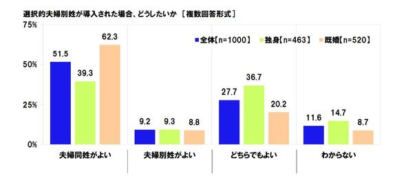 選択的夫婦別姓が導入された場合、どうしたいか聞いたところ、婚姻状況別に見ると「夫婦同姓がよい」は独身で39.3%、既婚で62.3%だった。