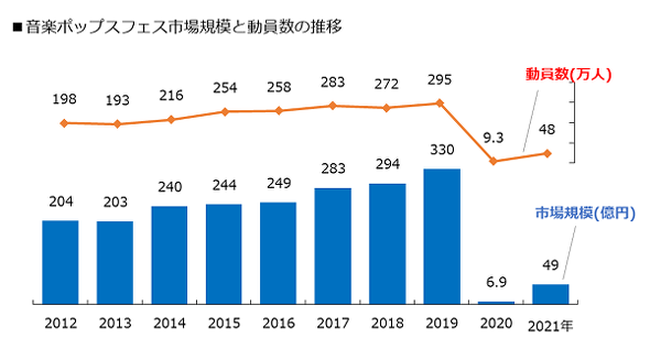 ぴあ総研が6月に発表した音楽フェスの市場調査によれば、2021年の音楽フェスの市場規模は、コロナ禍前の19年比85.1%減の49.2億円で、動員数も48.1万人(19年比83.6%減)と大きく減少している。一方で同社は、壊滅的状況だった20年と比べれば、イベント開催制限の段階的緩和により低空飛行ながらも浮上していると分析した。