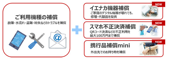 内容は4つの補償からできている。1つ目は機種の補償で、スマートフォンやタブレットの故障や水濡れ、盗難、紛失などに対応する。月額料金に応じて、5500円から1万2100円までの補償を行う。基本的には従来の「ケータイ補償サービス」と同様の内容。