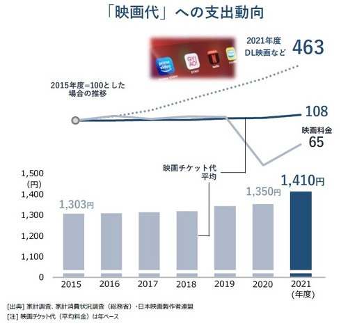 この結果、映画館での支払額は低迷する一方、映画チケット代は反対に上昇を続けており、21年度の平均額は1410円と過去最高を記録。「来場機会の減少を付加価値による客単価の上昇で補う構造へと変化している」(帝国データバンク)という。
