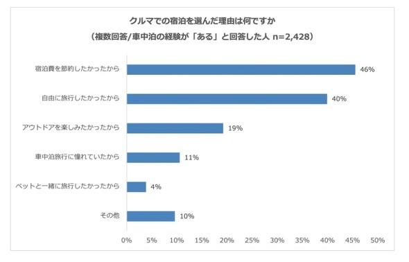 クルマでの宿泊を選んだ理由は、1位が「宿泊費を節約したかったから」(46%)で、2位が「自由に旅行したかったから」(40%)、3位が「アウトドアを楽しみたかったから」(19%)という結果に。