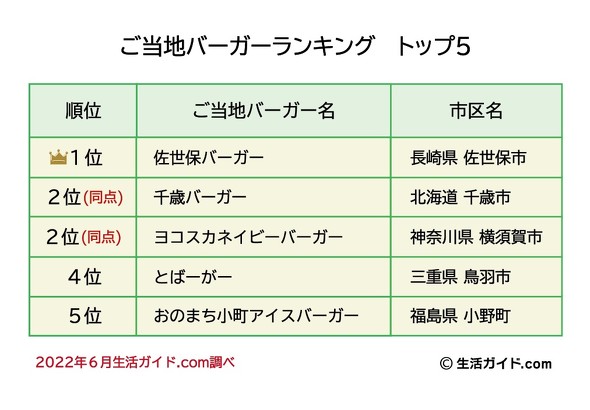 5位は香ばしく焼いたバンズに冷たいアイスを挟んだ福島県小野町の「おのまち小町アイスバーガー」が選ばれた。現在、町内では3店舗で提供しており、チョコソースやベリーソースをかけたものや、和風のものなど、さまざまな味のアイスバーガーを提供している。