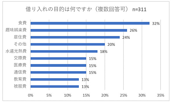 借り入れの目的について尋ねたところ、「食費」(32%)と答えた人が最も多かった。「趣味娯楽費」(26%)と「居住費」(24%)も20%を超えていたが、「水道光熱費」(18%)、「交際費」「医療費」「通信費」(いずれも15%)なども多く、まんべんなく借り入れていることがうかがえた。