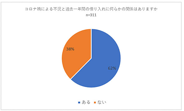新型コロナの感染拡大と過去1年間の借り入れに、何らかの関係はあるのだろうか。この質問に対して、「ある」と答えたのは62%。「貸し手である金融機関は通常の『食費』や『居住費』を少額借り入れの使途としては本来、想定していないと思われる。また、それ以外にも借り入れが生活費にまんべんなくあてられていることを考えると、コロナ禍による家計への悪影響が大きかったことが見て取れる」(同社)とした。