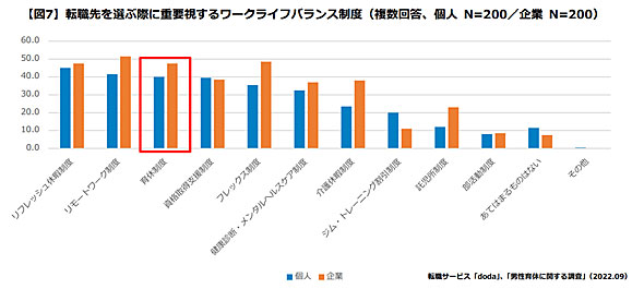 転職先を選ぶ際に「育休制度」は、どのくらい重視しているのだろうか。さまざまな制度があるなかで、個人では「リフレッシュ休暇制度」(45.0%)を挙げる人が最も多く、次いで「リモートワーク制度」(41.5%)、「育休制度」(40.0%)だった。企業では「リモートワーク制度」(51.5%)の声が最も多く、次いで「フレックス制度」(48.5%)、「育休制度」(47.5%)という結果に。