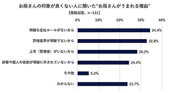 仕事ができるお局さんは多いものの、悪い印象を与える人も多いようだ。一体、何が原因なのだろうか。先の質問で「悪い印象」と答えた人に、お局さんが生まれる理由を聞いたところ「明確な全社ルールがないから」(34.4%)がトップ。次いで「評価基準が明確でないから」(32.8%)、「上司(管理者)がいないから」(28.2%)、「部署や個人の役割が明確に示されていないから」(24.4%)だった。
