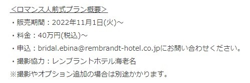 販売期間は11月1日以降で、料金は40万円以上としている。撮影やオプションを追加する場合は別途料金が必要だ。