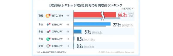 「取引所(レバレッジ取引)」では、1位がシェア66.3%で「BTC/JPY」、2位「ETH/JPY」27.3%、3位「XRP/JPY」5.7%となり、1位から5位まで、7月の月間取引ランキングの順位から変動のない結果となった。現物取引と同様に、「BTC」のシェアが下がり、「ETH」のシェアが伸びている。