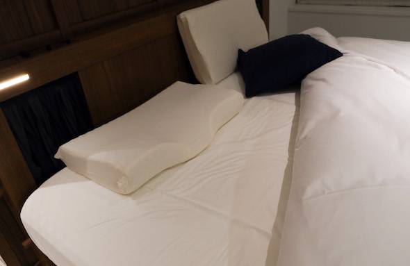 寝具の寝心地のよさは十分に感じられた。無数の凸で腰をやさしく支えるマットレスと首筋にフィットする枕は、いずれも身体への負荷を感じづらく、ラクな体勢で眠ることができた。ふわふわとした軽い掛け布団も気持ちいい。ベッドに横たわると10分ほどで眠たくなり、ストレスなく入眠できた。