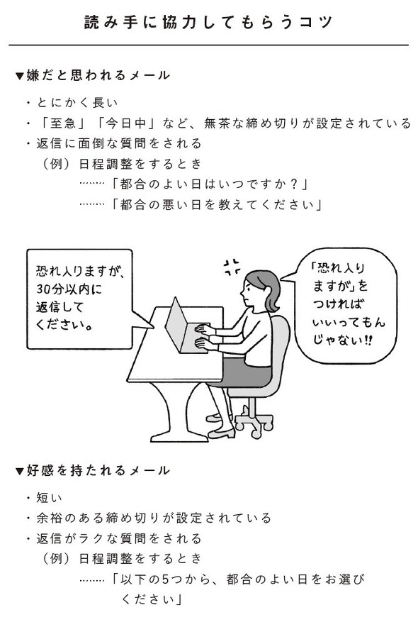 読み手に負担をかけないメールを送りましょう。要は、相手に「めんどくさいな」と思わせないことです。できるだけ短く書いたり、返信の手間をラクにしたりしてください