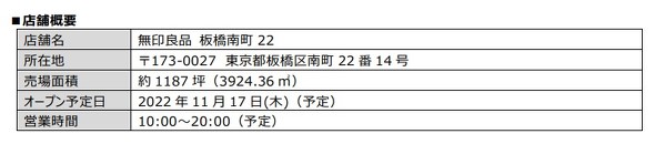 無印良品を展開する良品計画は9月15日、関東最大級の大型路面店「無印良品 板橋南町 22」(東京都板橋区)をオープンすると発表した。開店日は11月17日を予定している。