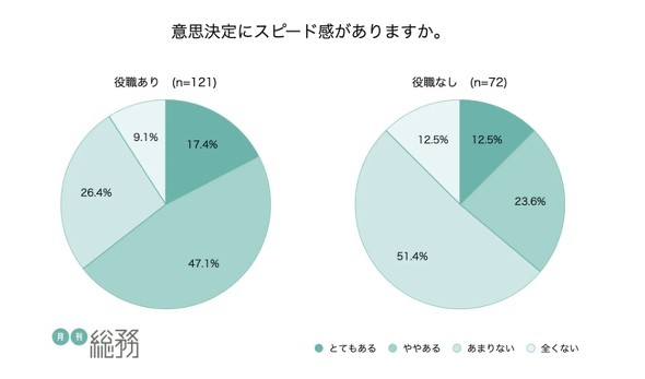 役職別で分析すると、「役職あり」の64.5%が意思決定にスピード感があると回答した。一方、「役職なし」の場合は36.1%という結果に。