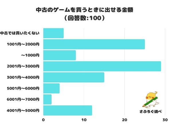 以下、4位は「4001〜5000円」、5位は「〜1000円」、6位は「中古では買いたくない」、7位は「5001〜6000円」、8位は「6001〜7000円」だった。中古のゲーム自体買いたくないという人や、中古のゲームには高い値段をかけたくない人も多くいるようだ。