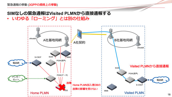 図のように、例えばA社のユーザーが緊急通報する際にB社の設備を使うとする。緊急通報はAttachもRegistrationも不要なので、A社の加入者DBに許可をもらう必要はない。しかも、A社の電話網を使わずに、訪問先のB社の電話網を使って、VoLTE設備から直接通話できる仕組みになっている。一見、ローミングしているように見えるが、まったく違う流れで通報している。ただし、日本ではこの仕組みは動作しない。