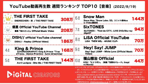6位以降は「Snow Man」(144万)、7位は「SixTONES」(94万)、8位「LiSA Official YouTube」(70万)、9位「Hey! Say! JUMP」(70万)、10位「福山雅治 Official」(44万)の順となった。