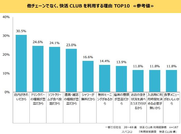 他チェーンでなく快活CLUBを利用する理由を聞くと、1位は「店内がきれいだから」(30.5%)、2位は「ドリンクバーの種類が豊富だから」(24.6%)、3位は「ソフトクリームが食べ放題だから」(24.1%)、4位は「漫画・雑誌の種類が豊富だから」(23.0%)、5位は「シャワーが無料だから」(16.6%)であった。