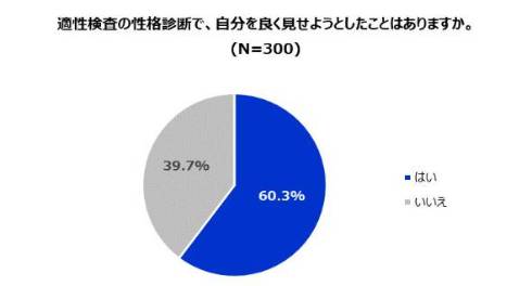 「適性検査の性格診断で自分を良く見せようとしたことはあるか」という質問に、60.3%の人が「はい」と答えた。