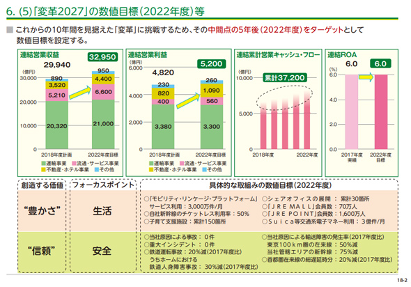 「変革2027」では、22年度の数値目標を示している。18年度計画で連結営業収益2兆9940億円としていたものを、22年度には3兆2950億円にまで伸ばすと計画していた。21年度の連結営業収益は、1兆9789億円と逆に減っている。こちらは25年度には3兆900億円を目標にしている。