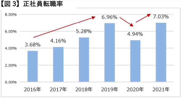 マイナビが行った「転職動向調査」によると、21年の正社員転職率は過去6年間で最も高い水準だった。同社では過去と比較して転職がしやすくなったことで、待遇改善のために転職をする人も増え、以前より自分の好きなタイミングで働く環境を選びやすくなったという。
