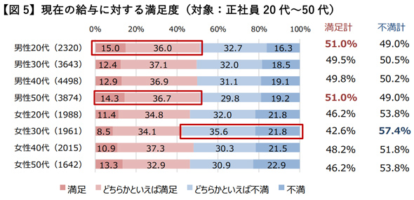 なぜ女性は、男性と比較して転職を機に年収が下がる人が多いのだろうか。マイナビが22年7月に行った「中途採用・転職活動の定点調査」では、現在の給与に対する不満が最も高かったのは女性30代(57.4%)。全年代において、男性より女性のほうが給与に関する満足度が低い結果だった。
