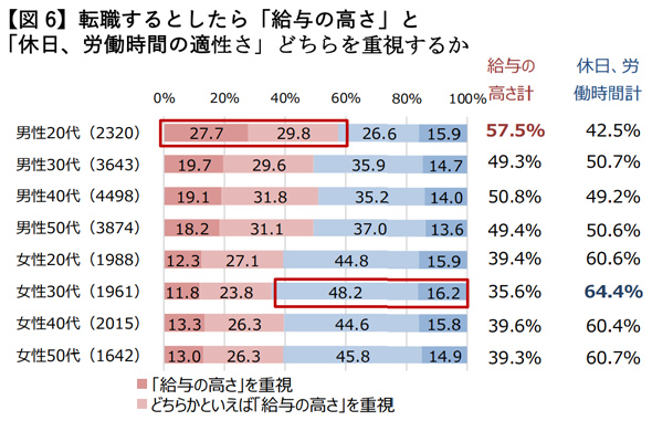 しかし、同調査で同じ対象者に、転職をするとしたら「給与の高さ」と「休日、労働時間の適性さ」どちらを重視するかを聞いたところ、「給与の高さ」を最も重視するのは男性20代(57.5%)、「休日、労働時間の適性さ」を最も重視するのは女性30代(64.4%)となり、全年代において男性より女性のほうが「休日、労働時間の適性さ」を重視している結果となった。