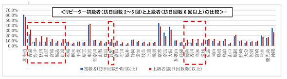 四国地方に関しても同様に、リピーター上級者の訪問意向が高いことが分かった。初級者と比較して、徳島県+6.6ポイント、香川県+7.7ポイント、高知県+7.7ポイント、愛媛県+6.4ポイント、それぞれ上回った。