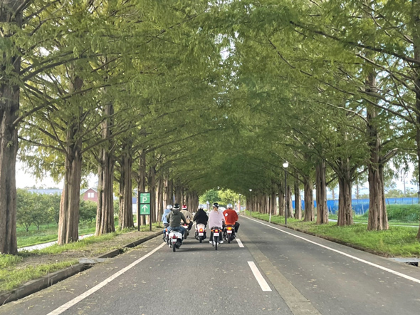 滋賀県を満喫できるアクティビティとして、EVバイクのレンタルも用意。人気の並木道や湖岸沿いを、風をきる感覚で走行できる。