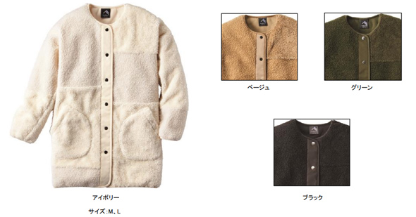 5位は、異なる毛足のボアパターンをパッチワーク風に織り交ぜたロングアウター「防風パッチワークノーカラーロング」。防風フィルムを使用し、防寒性も優れている。両サイドに大型ポケットを付けた。こちらも人気製品で、前年比166%の6万5000着を生産予定だという。