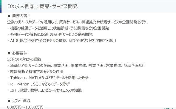 2つ目の事例は、社内のリソースやデータの拡充を通じて、既存サービスの機能拡充や新規サービス開発に取り組むポジションの求人だ。必要要件にはいわゆるデータアナリストの経験や、新サービスの企画経験などが記載してあり、仕事内容や職種を絞り込まず「いずれかに当てはまる人を募集しています」と打ち出している。