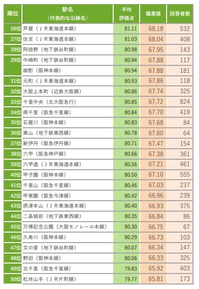 住み続けたい駅ランキングでは、1位が「人丸前(山陽電鉄本線)」(85.87)、2位が「さくら夙川(JR東海道本線)」(85.20)、3位が「夙川(阪急神戸線)」(85.16)だった。