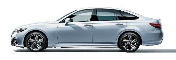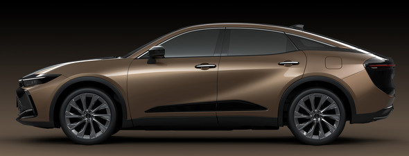 対して今回のクラウン・クロスオーバーはボディの厚みを生かした力強さを持たせつつ、リヤタイヤの上で一度ウエストラインをキックアップさせて、後輪の蹴り出し感を表しつつ、ルーフから降りてくる面とウエストラインの間の黒い化粧プレートがデザイン上の整流板の役割を果たし、ウェストラインの流れも、ルーフラインの流れも、相互に阻害されないように配慮している。